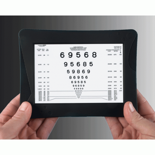 Illuminated Near Card System provides a choice of interchangeable Near Cards including Letters, Numbers, Illiterate ‘E” and Amsler Grid which can be use hand held, resting on a table surface or hung from a phoropter rod either vertically or horizontally. Uses either AC, (4) AAA batteries or USB Computer Connection for power. Unit is well protected in a rubberized sure grip frame. Unit is LED based for long life and will not yellow. Back-lit display provides standardized illumination which illuminates over any reflections. No need to bring over a lamp for the patent to read the cards. The cards are used at 40 cm and stay crisp, clean and clear.