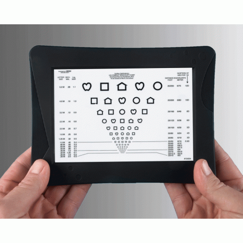 Illuminated Near Card System provides a choice of interchangeable Near Cards including Letters, Numbers, Illiterate ‘E” and Amsler Grid which can be use hand held, resting on a table surface or hung from a phoropter rod either vertically or horizontally. Uses either AC, (4) AAA batteries or USB Computer Connection for power. Unit is well protected in a rubberized sure grip frame. Unit is LED based for long life and will not yellow. Back-lit display provides standardized illumination which illuminates over any reflections. No need to bring over a lamp for the patent to read the cards. The cards are used at 40 cm and stay crisp, clean and clear.